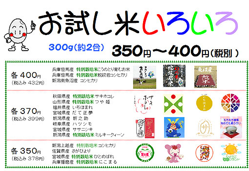 300g(約2食分)を脱気包装した「お試し米」を色々と ご用意して おります。